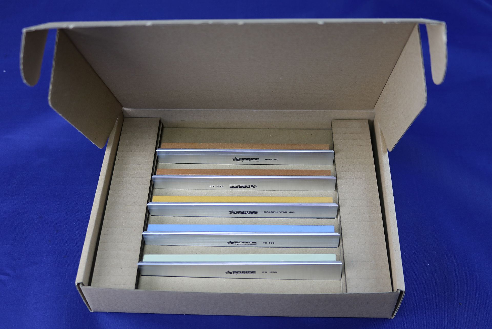 - Boride PC (F1200 grit) – ultra jemný kámen pro finální leštění a dosažení zrcadlového efektu.