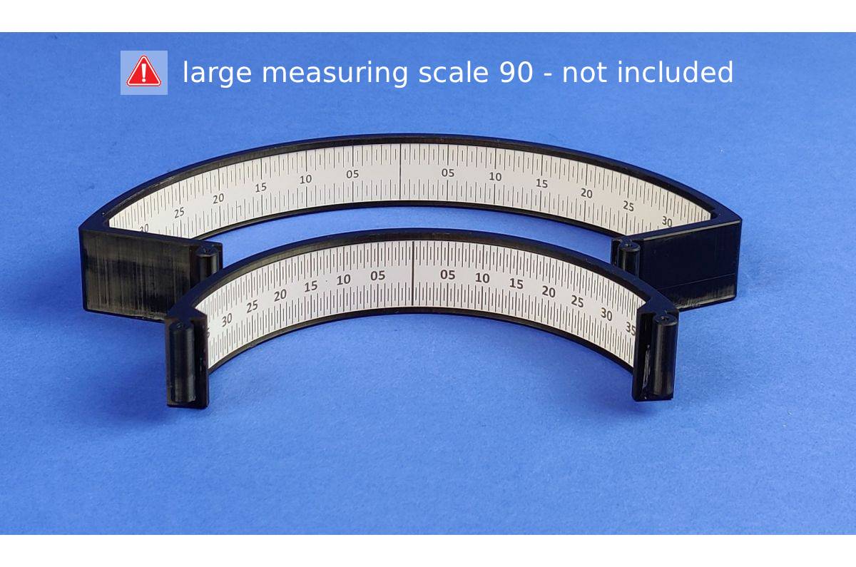 La principal ventaja es su construcción modular: si necesitas medir una hoja más ancha, basta con cambiar la escala. Esta se fija con dos tornillos M3 y queda perfectamente alineada gracias a las guías. La gran escala de medición 90 intercambiable permite insertar y medir hojas con una altura de hasta 54 mm (de forma estándar) y 87 mm (con la escala 90).
